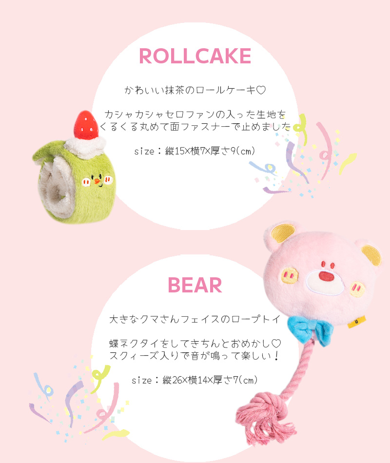 ■ROLLCAKE 縦15×横7×厚さ9(cm) ■BEAR 縦26×横14×厚さ7(cm) ■CRACKER 縦32×横9×厚さ9(cm) ■HAT 縦21×横12×厚さ12(cm) ■CAMERA 縦14×横15×厚さ9(cm) ■CUPCAKE 縦17×横10×厚さ10(cm) |