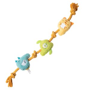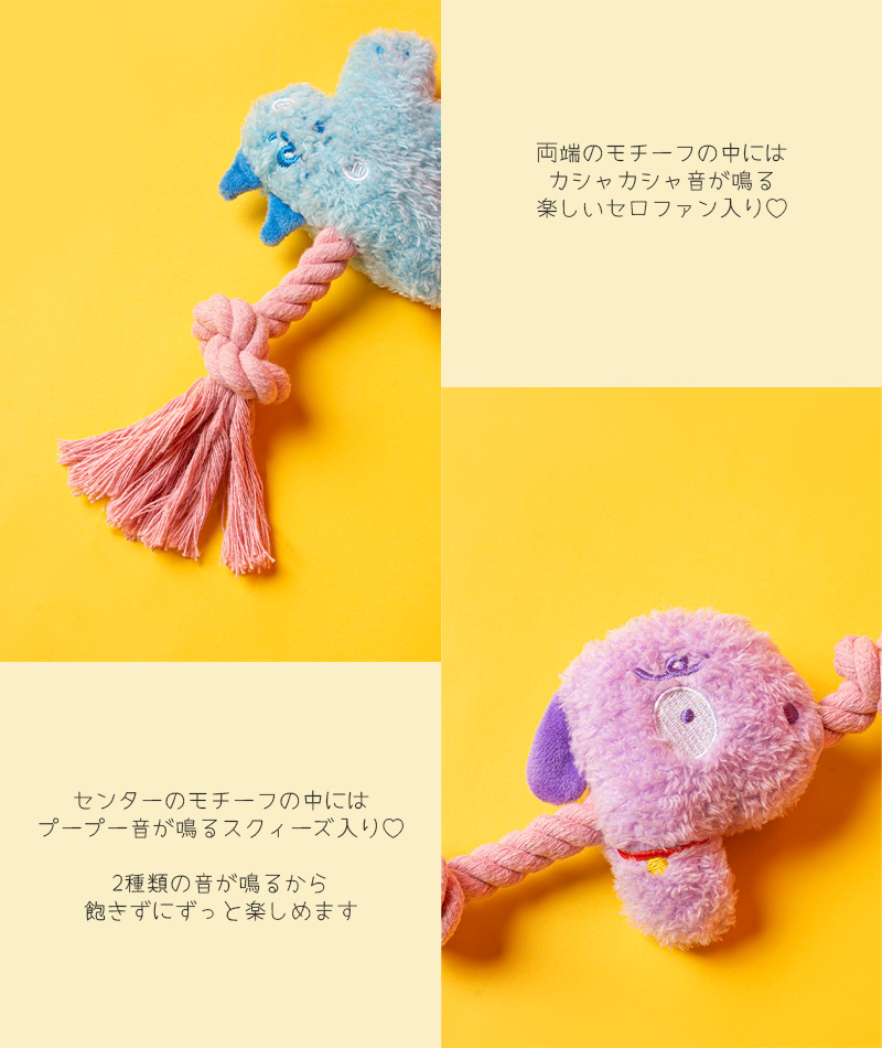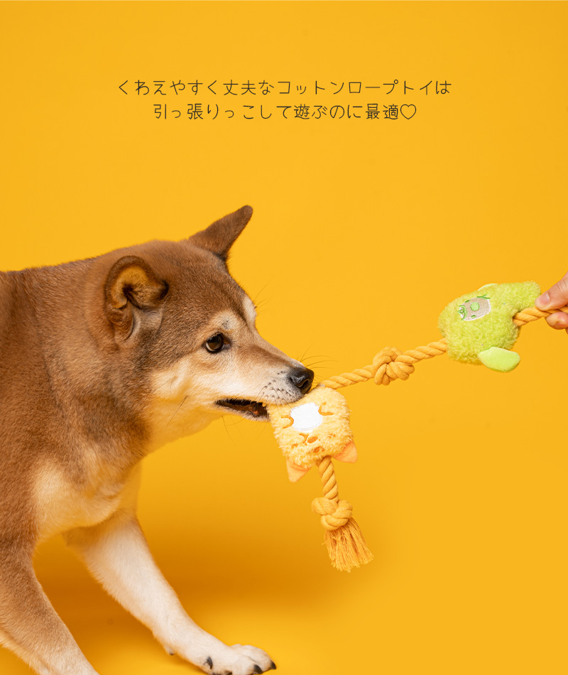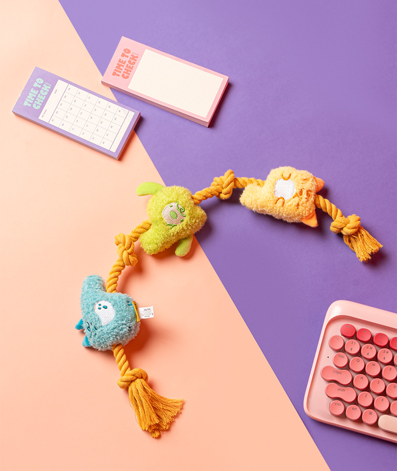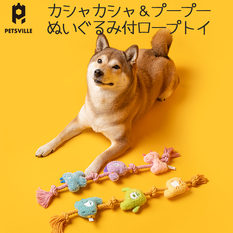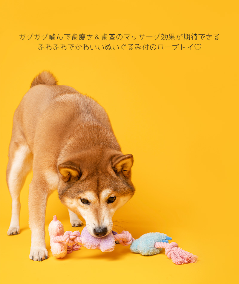 カシャカシャ&プープー音が鳴るモチーフで遊んだり、噛み応えのあるロープを噛んでストレスを発散したり。 |