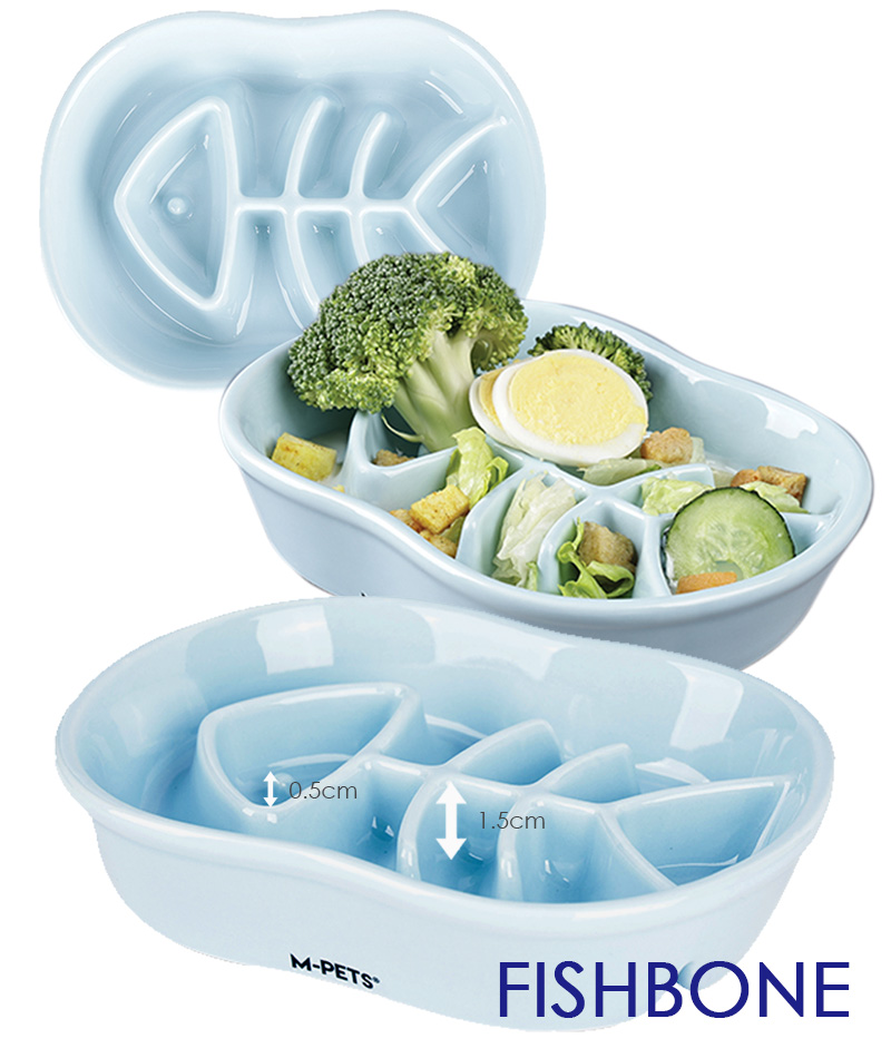 かわいいバラの花デザインと魚の骨デザインの陶器製早食い防止皿です。高さの異なる凸凹が邪魔をして、フードの丸飲みを抑制し食事速度を軽減! |